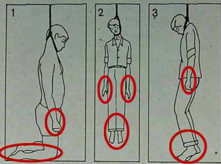 - ASSENZA DI IPOSTASI A CALZINO E A GUANTO: Se il cadavere fosse stato sospeso dopo alcune ore dalla morte, le ipostasi si potrebbero essere già formate nelle zone declivi del corpo al momento della morte. La loro distribuzione sarà determinante ma dovrà essere posta sempre in correlazione con gli altri reperti oggettivi nonché con il dato storico-circostanziale.